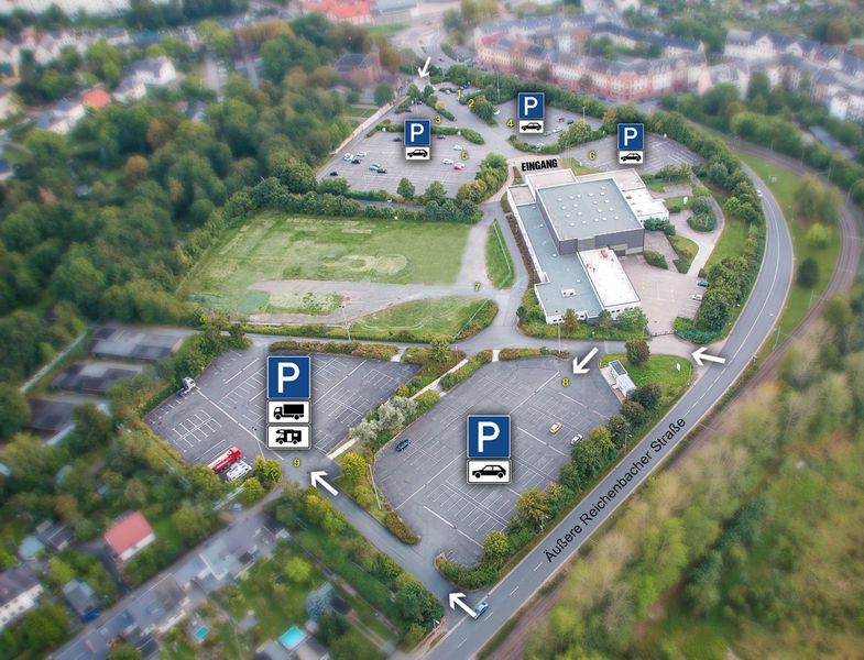 benutzen Sie die Autobahnabfahrt Plauen Ost der Autobahn A72, fahren Sie in Richtung Stadt Plauen. An der zweiten Ampel fahren Sie in Richtung Vogtland Klinikum/Festhalle links ab. Sie befinden sich dann bereits auf der Äußeren Reichenbacher Straße. Von hier sind es noch etwa 800m, bis Sie links einbiegend die Parkplätze an der Festhalle Plauen erreichen.