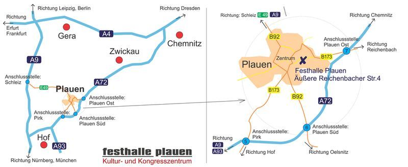 benutzen Sie die Autobahnabfahrt Schleiz der Autobahn A9, fahren Sie in Richtung Plauen. Vor Ihnen liegen etwa 30km Landstraße bis Plauen. In Plauen richten Sie sich bitte nach der Ausschilderung "Reichenbach", "Vogtlandklinikum". Bevor Sie das Einkaufscenter Elsterpark passieren, müssen Sie rechts in die Äußere Reichenbacher Straße einbiegen. Von hier aus sind es noch etwa 800 Meter, bis Sie links einbiegend die Parkplätze an der Festhalle Plauen erreichen.